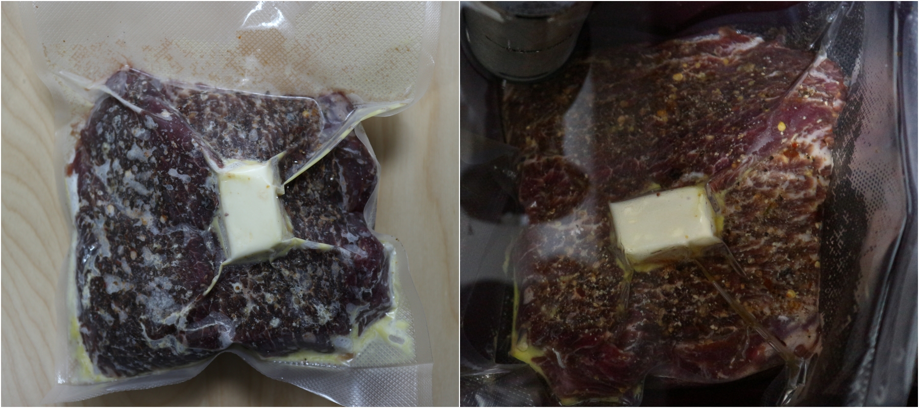 사진의 왼쪽 고기는 냉장실에서 보관중이던 고기를 수비드로 돌린것입니다.