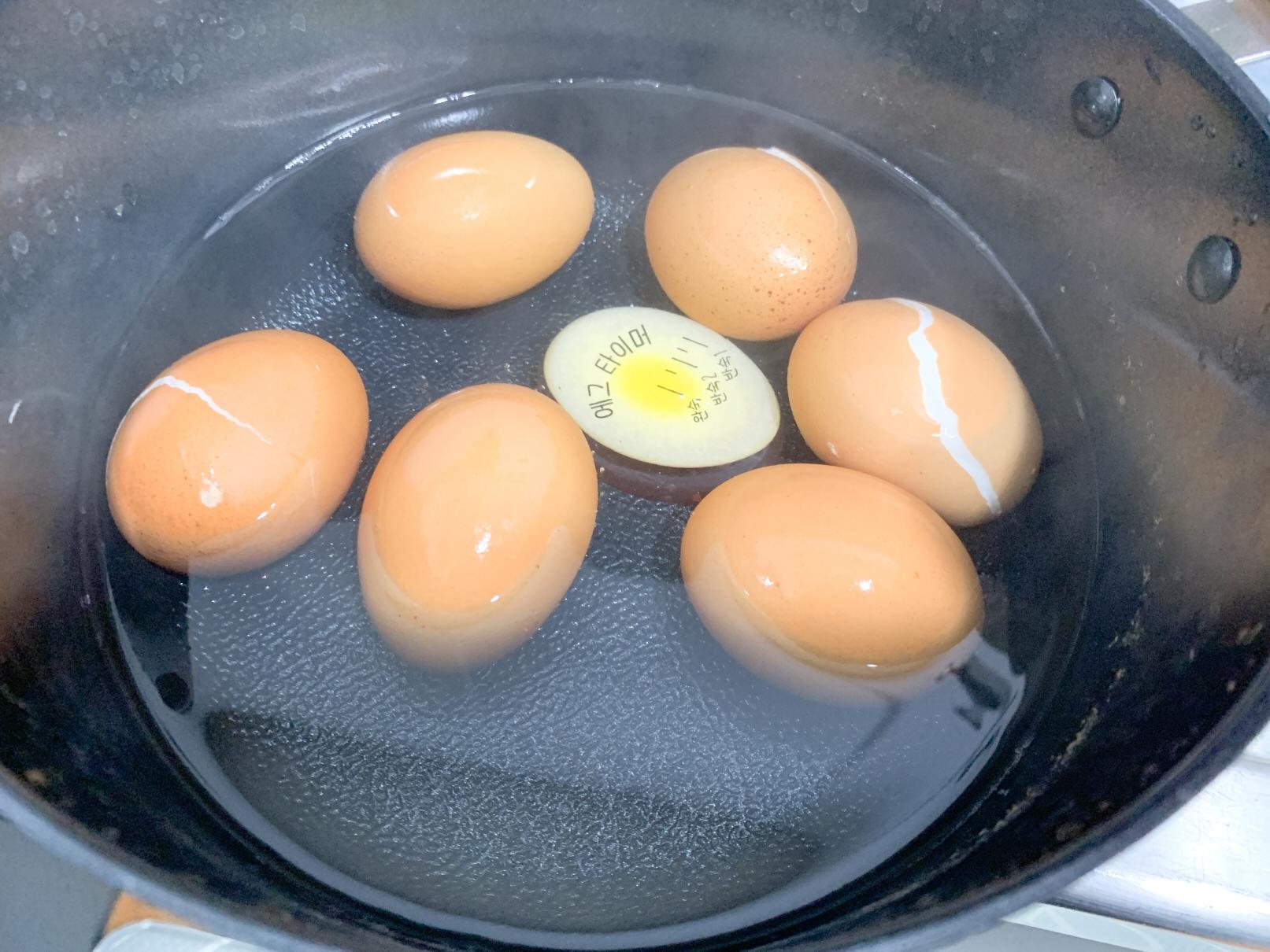 우선 냄비에 계란 6개와 계란타이머 를 함께 넣고 가장 센불에서 진행하도록 했습니다.
