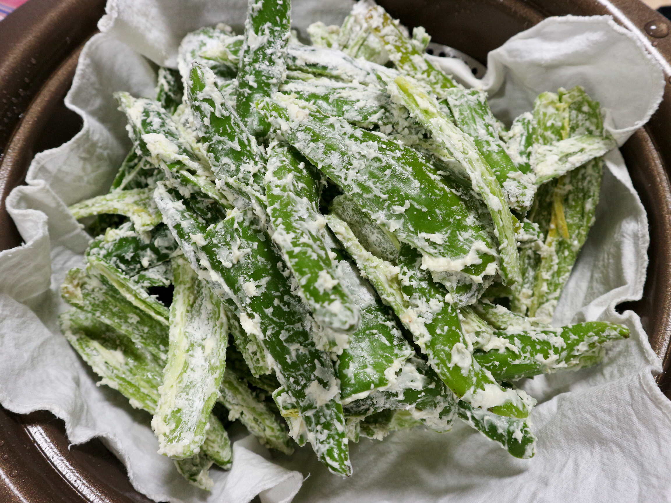 튀김옷을 묻혀준 고추를 찜기에 올려놓고 한김 쪄냅니다.