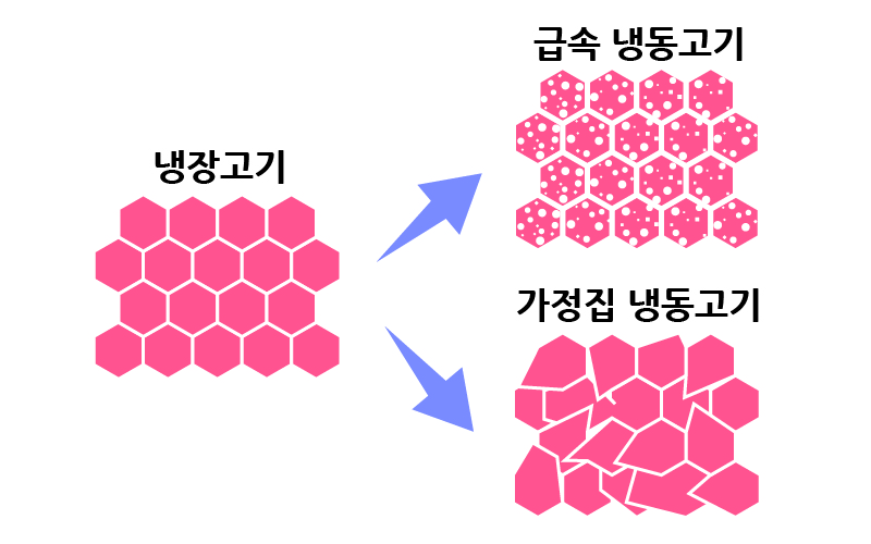 처음부터 냉동상태에서 판매하는 고기의 경우에는 급속냉동 시킨 고기이기 때문에 집에서 냉동실에 넣어서 서서히 냉동시키는것과는 차이가 있습니다.