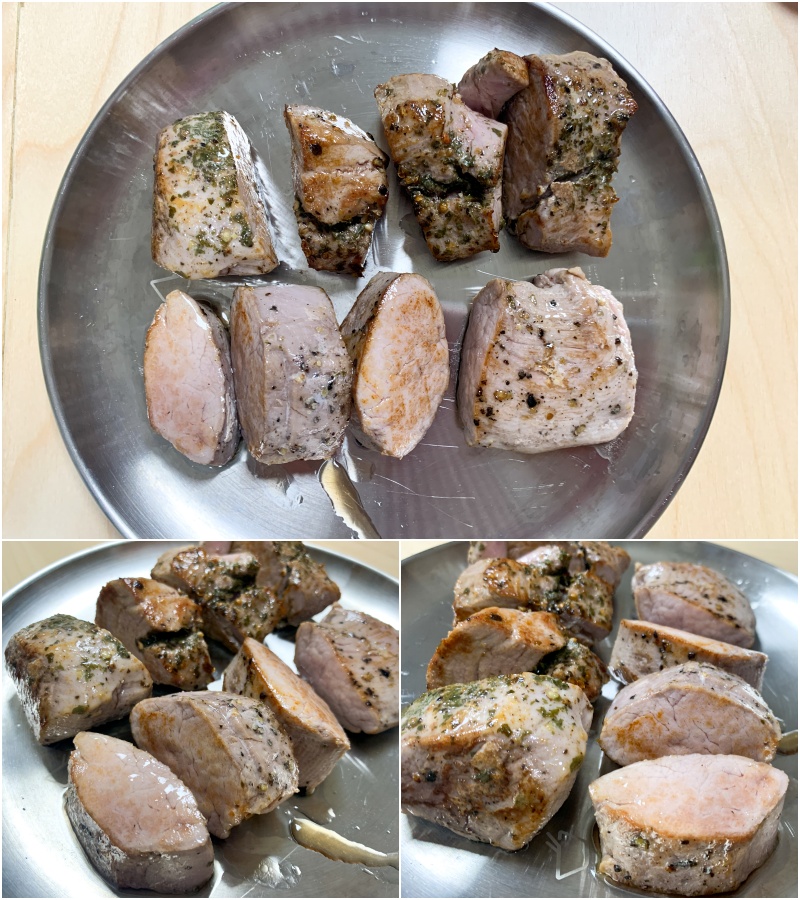 예전에 유튜브에서 수비드머신으로 하는 조리법이 아닌 프라이팬에 돼지안심을 이용해서 온도와 시간, 조리법을 보고 해서 먹어본적이 있었는데요.