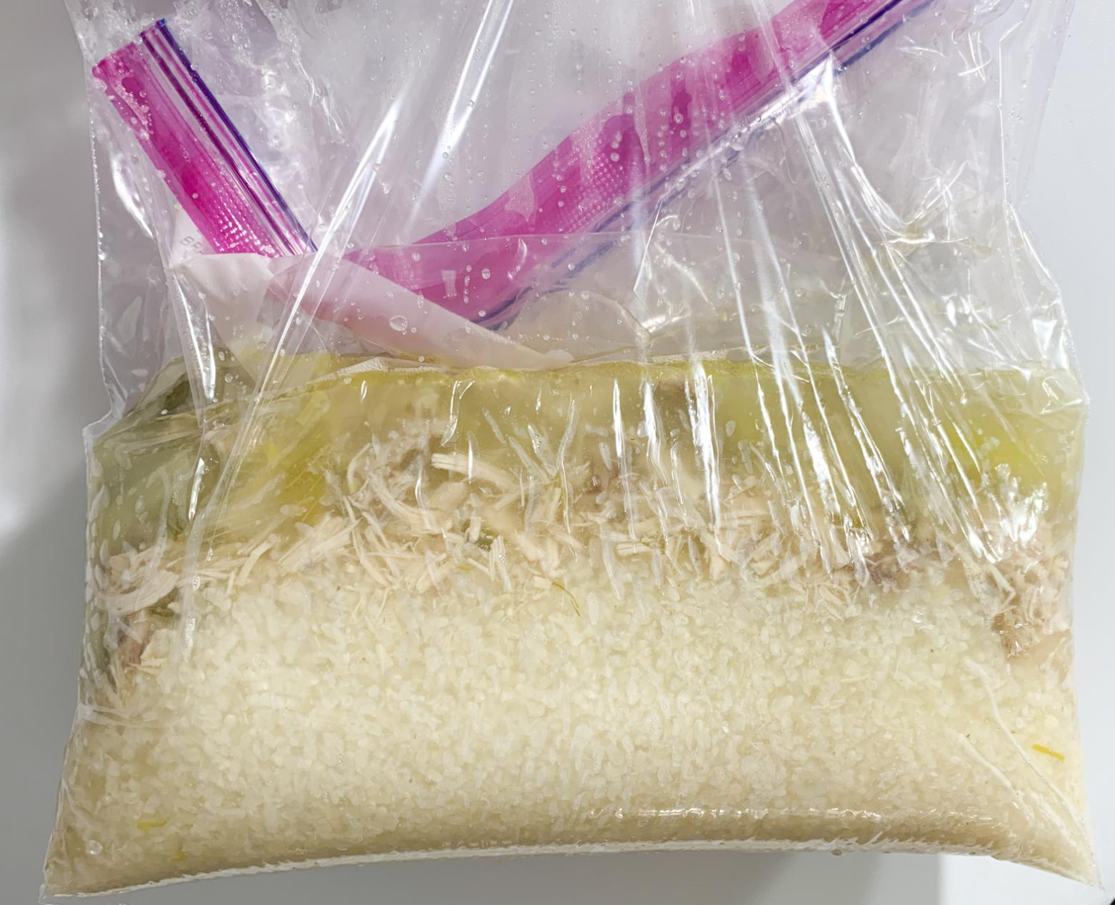 지퍼백에 찹쌀과 육수, 물, 닭고기등의 재료를 넣어줍니다.