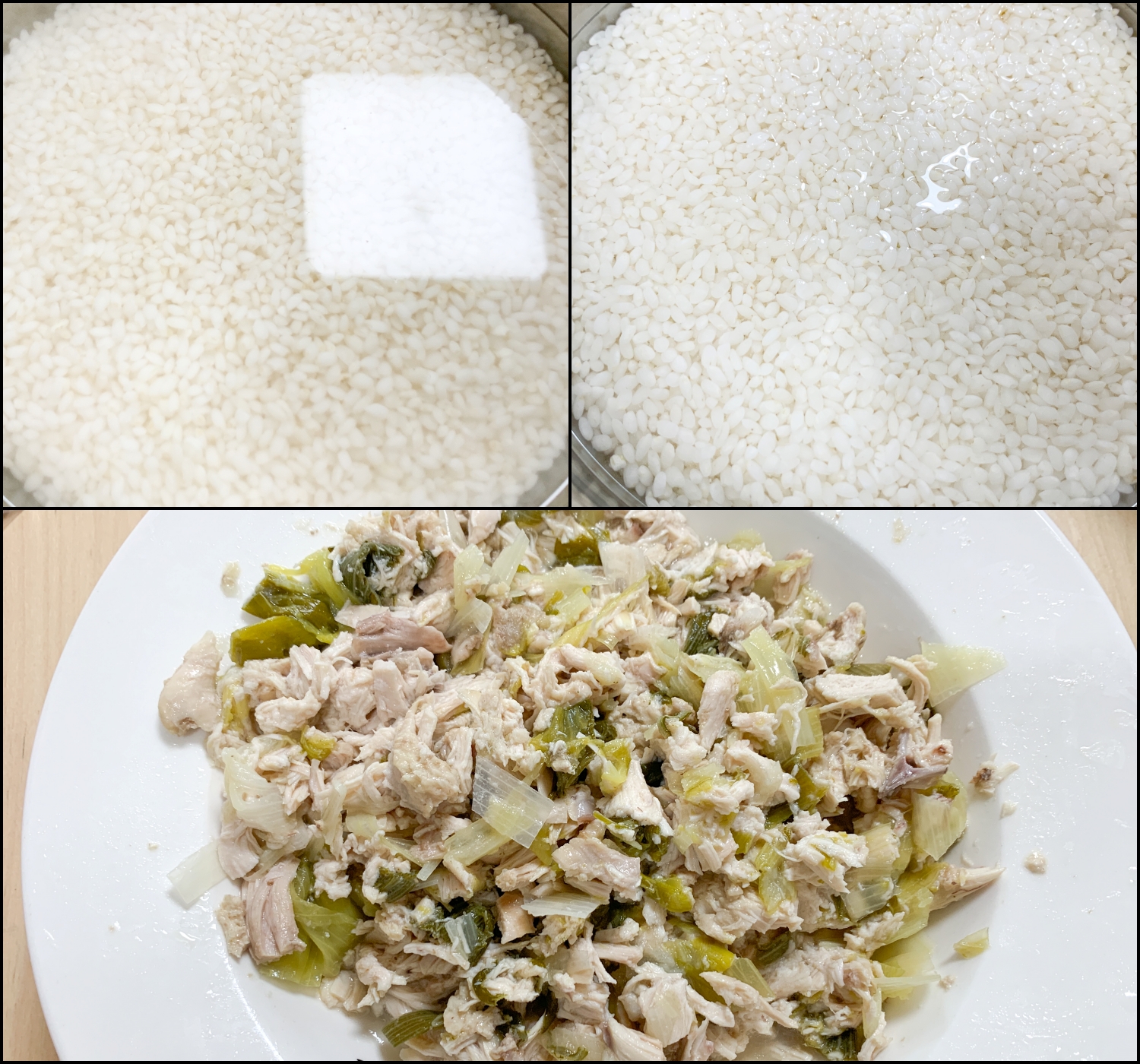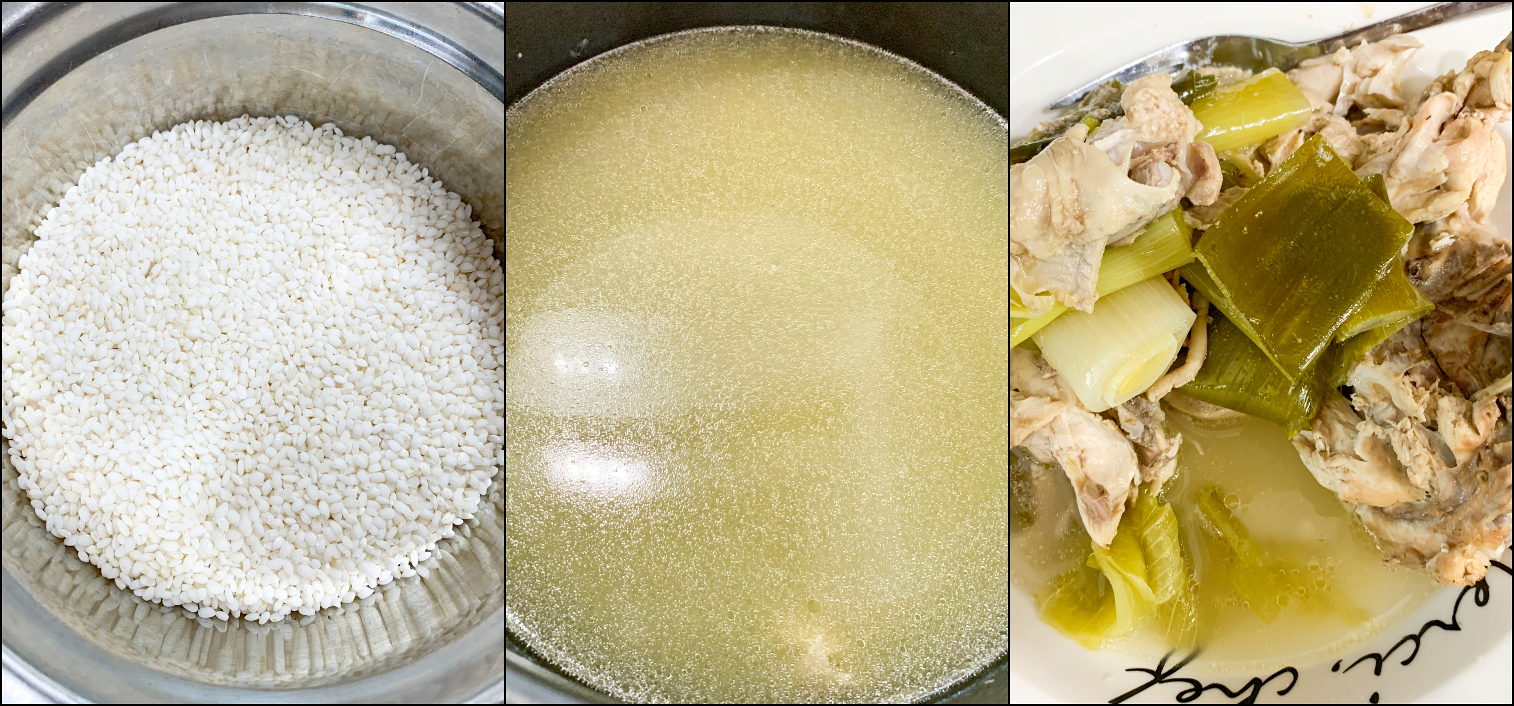 30분 이상 불린 찹쌀과 뽀얗게 우러난 닭육수 그리고 여분의 닭고기를 준비했습니다.