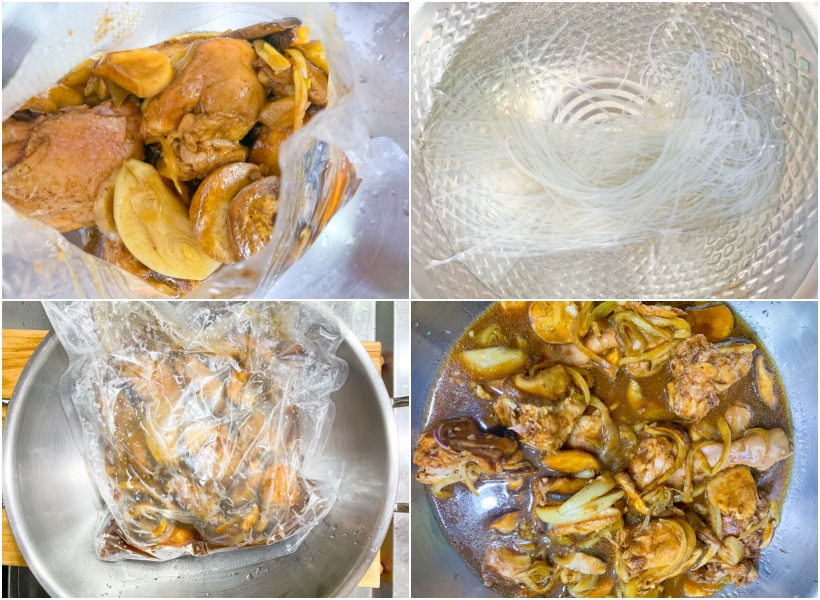수비드가 다 끝나고 난 다음 조리된 찜닭을 바로 먹지 않습니다. 바로 먹어도 상관이 없긴 합니다. 하지만 우리가 흔히 생각하는 찜닭은 약간 걸쭉한 국물에 당면이 빠질 수 없기 때문이죠. 당면은 미지근한 물에 30분 이상 불려주도록 미리 준비를 합니다. 그리고 큰 냄비에 수비드가 완성된 찜닭을 부어놓죠.
