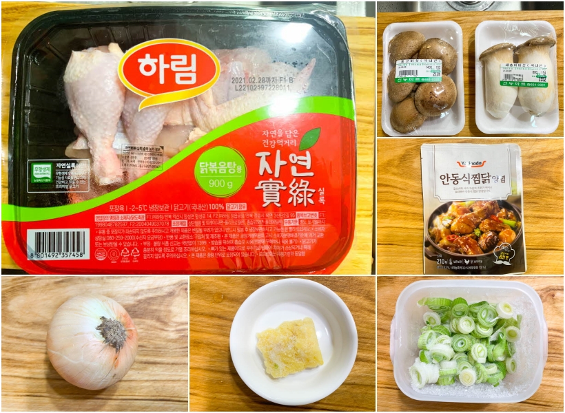 감자를 대신할 식감을 책임져줄 버섯, 양파 반개, 다진 마늘 한 스푼, 대파 한 줌을 준비해줍니다. 그리고 간장 등 다양한 양념재료를 활용하는 대신 [요리하다 : 안동식 찜닭 양념]을 사용하여 찜닭을 만들도록 하겠습니다.