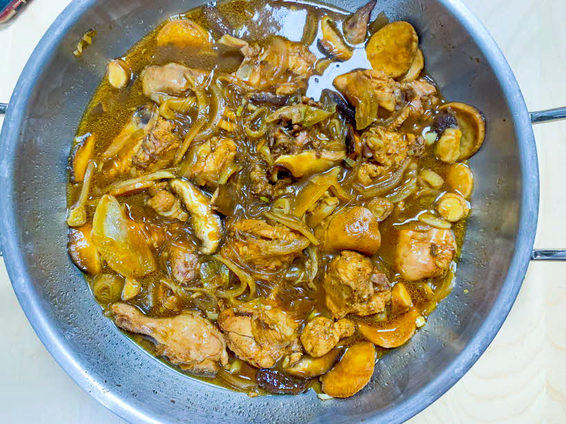 넓은 냄비에 하나 가득 담긴 찜닭 위에 미리 불려놓은 당면을 투하시킨 후 당면이 다 익을 때까지 한번 더 끓여줍니다.
