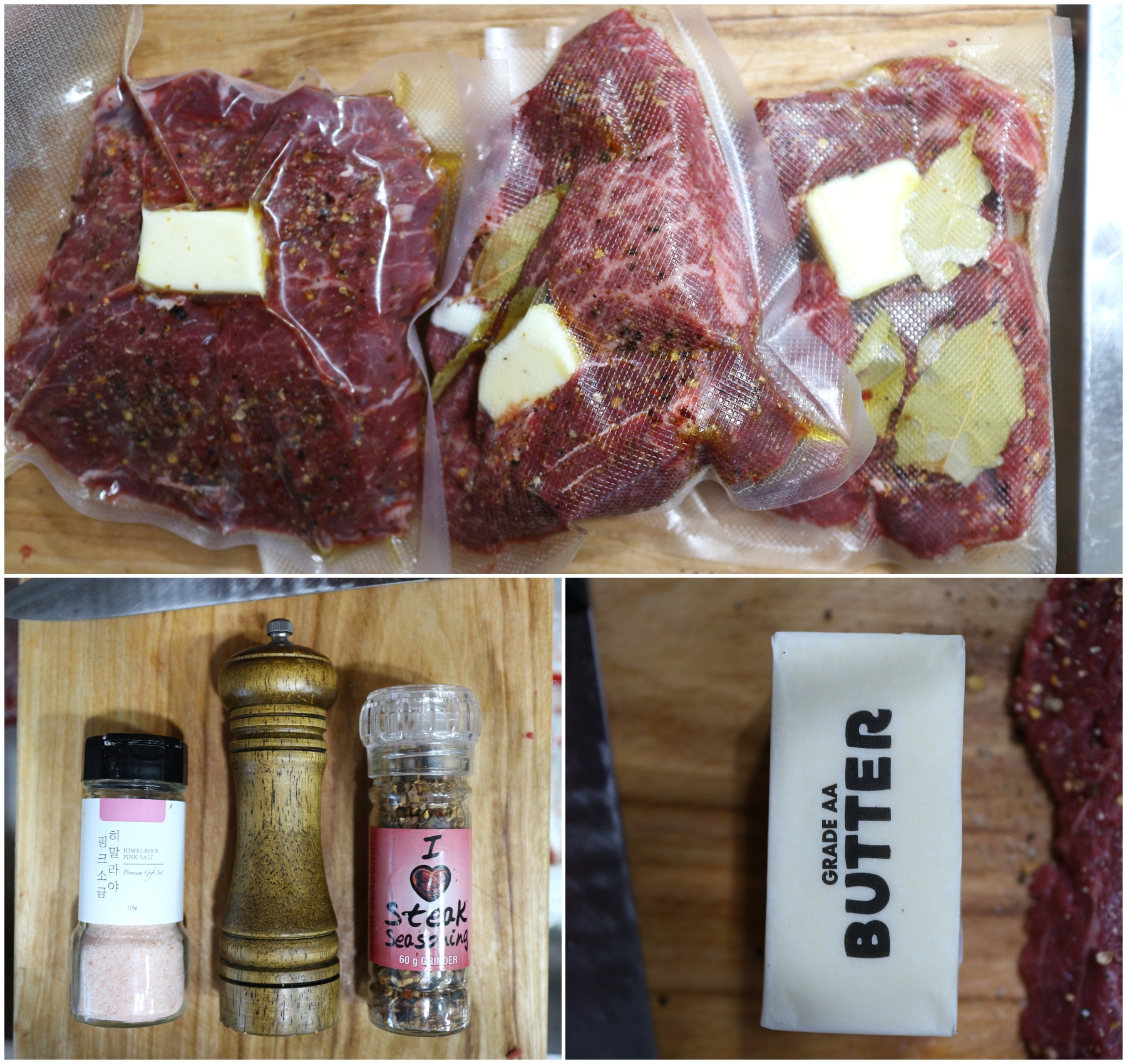 진공포장에 코스트코 부채살과 함께 넣은 양념은 소금, 후추, 시즈닝가루, 버터, 월계수잎, 올리비오일을 넣었습니다.