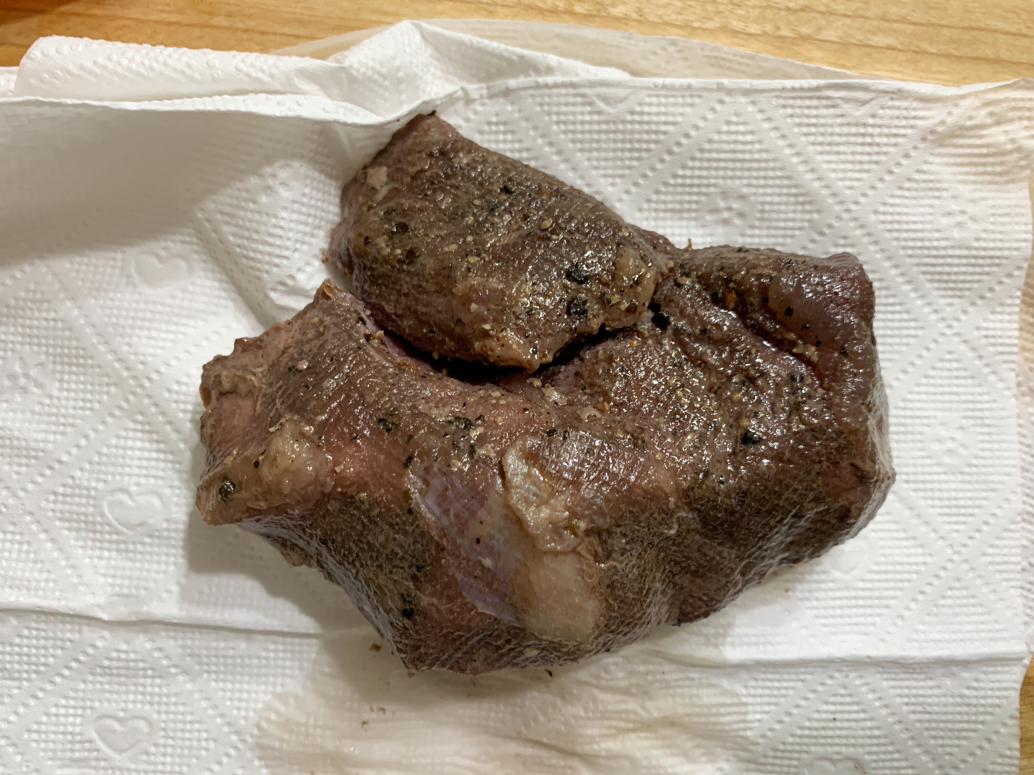 그래서 많은 키친타월을 이용해서 코스트코 부채살 스테이크 수비드를 막 끝낸 고기의 수분을 제거해 줍니다.