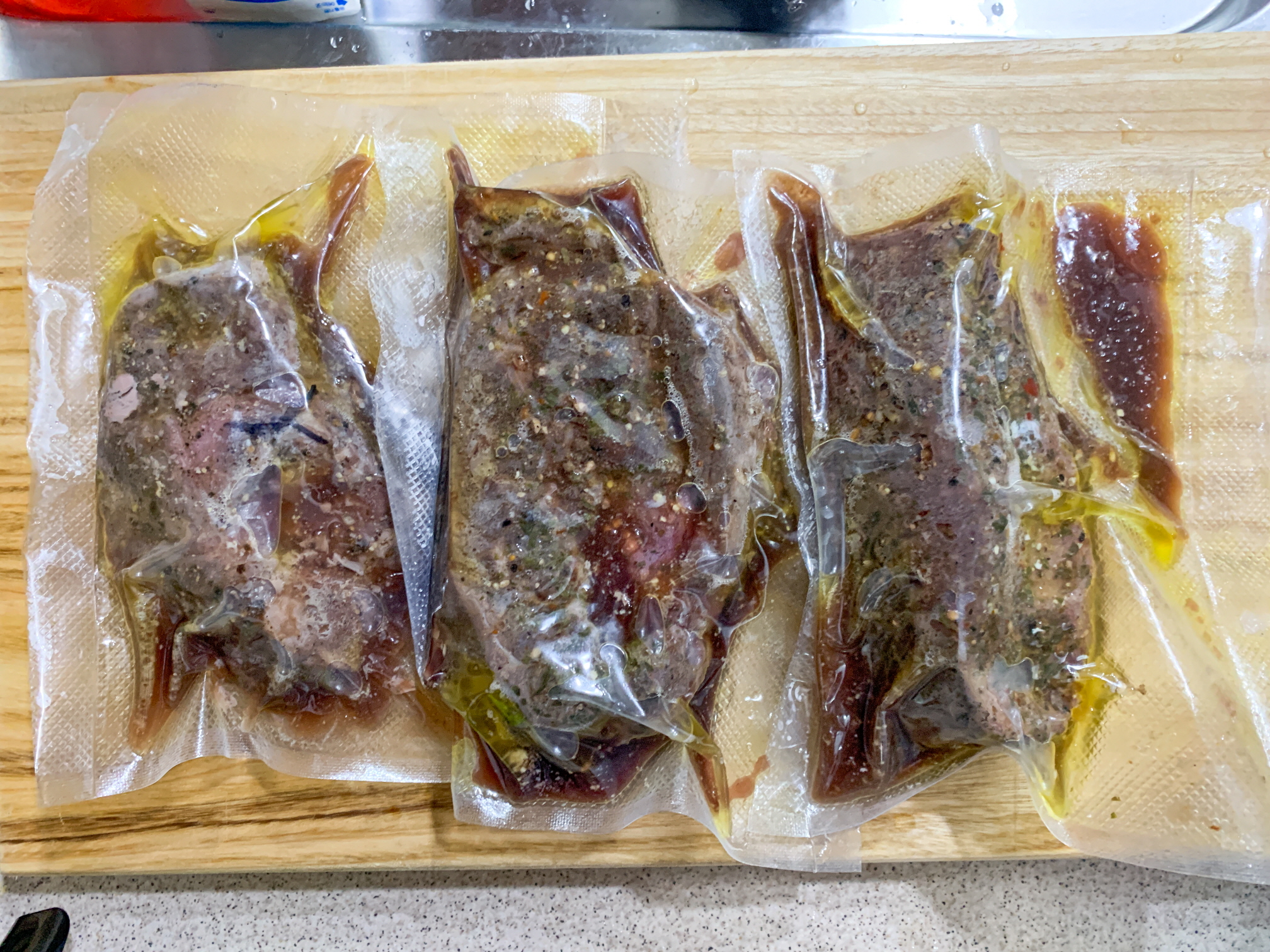 The three frozen fang-sal meat shown above are the Costco fang-sal steak meat that we kept frozen last time.