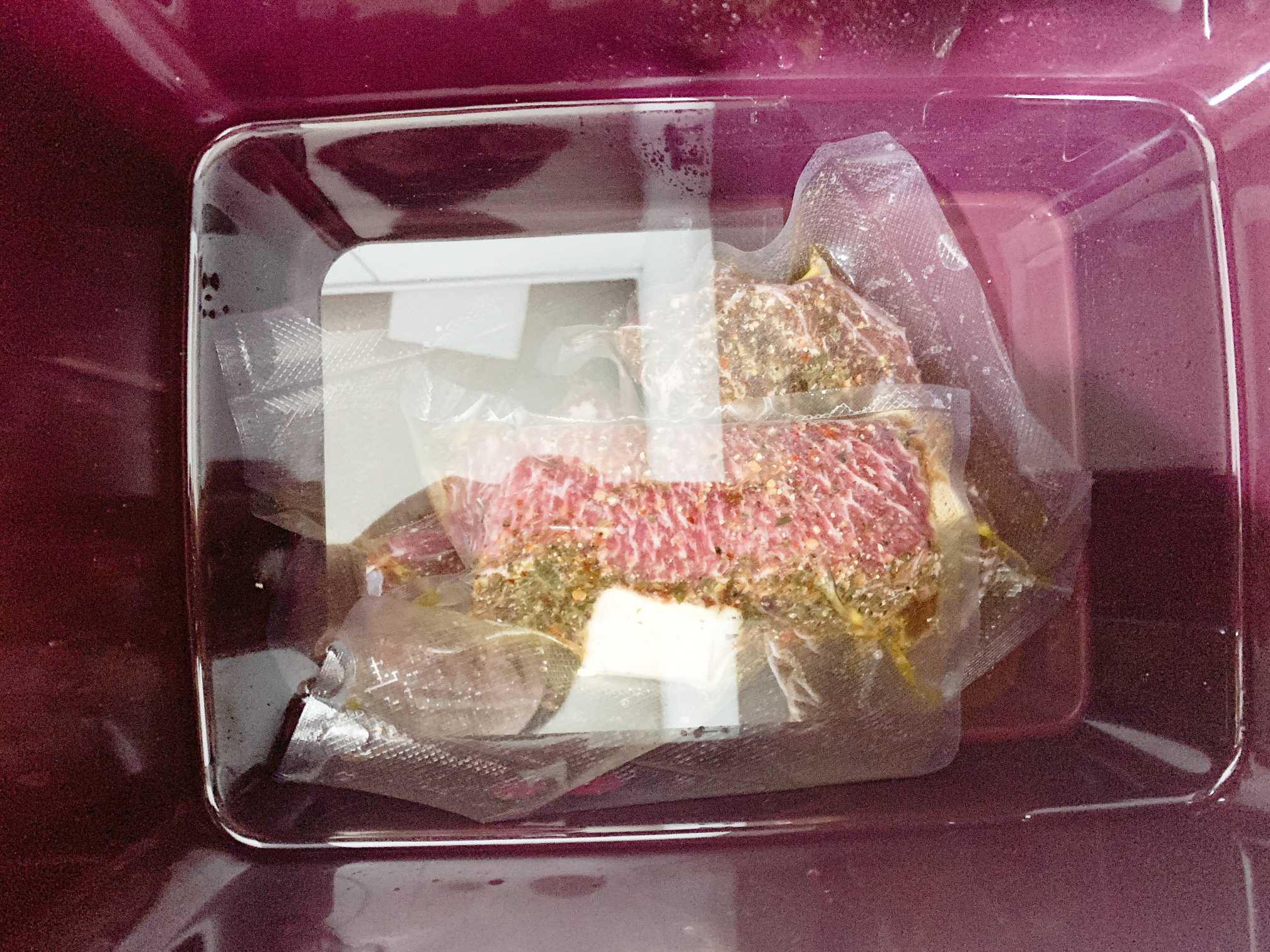 설정한 시간이 모드 지난 후 수비드 컨테이너에서 꺼낸 직후의 코스트코 부채살 스테이크 입니다.