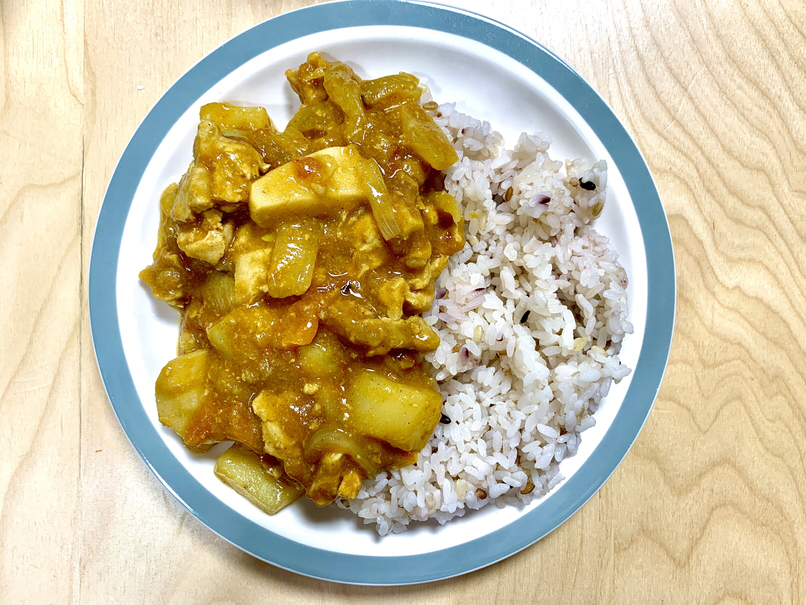 위 사진을 보시면 아시겠지만 재료가 익기는 했지만 섞이지 않은 모습을 확인하실 수 있습니다. 고형카레를 사용해서 전혀 카레처럼 보이지도 않지요.