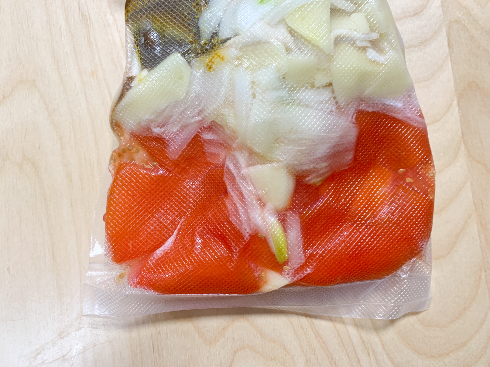 그 다음은 토마토를 손으로 으깨주세요. 토마토를 미리 으깨고 난 다음 진공포장을 할때 진공이 잘 안되거나 토마토즙이 새어나올 수 있기 때문입니다.