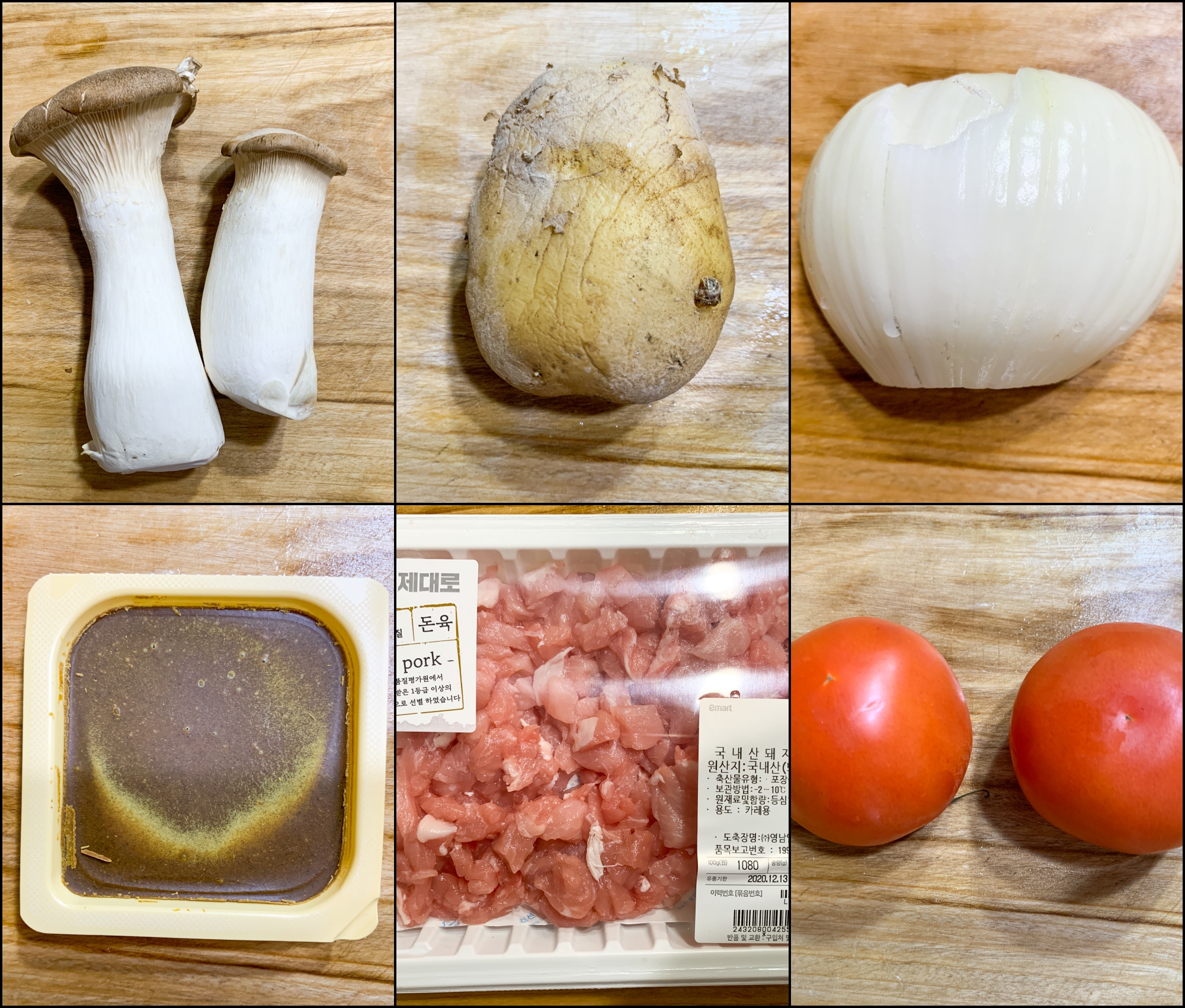 재료 : 새송이 버섯 2개, 감자 1개, 양파 1개, 카레가루 또는 고형카레, 카레용 돼지고기, 토마토