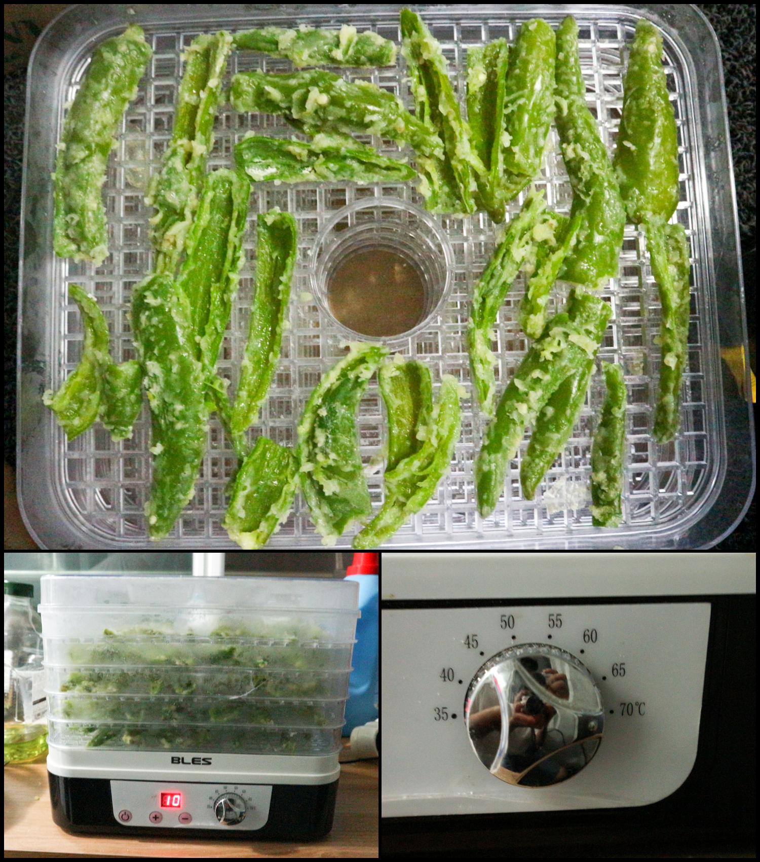 식품건조기에 고추를 말리는 시간과 온도는 70℃ / 15시간이 걸렸습니다.