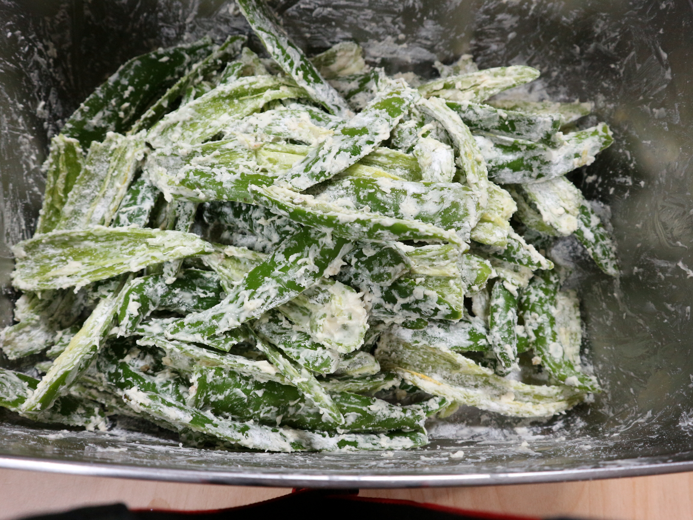 고추를 씻어냈으면 여기에 튀김가루 또는 찹쌀가루를 섞어 묻혀줍니다.