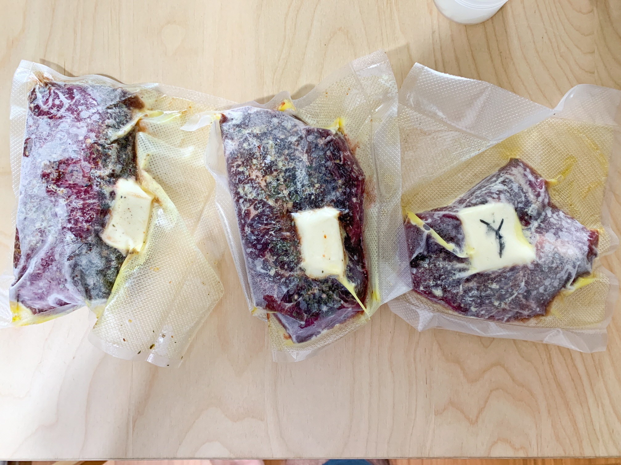 The three frozen fang-sal meat shown above are the Costco fang-sal steak meat that we kept frozen last time.