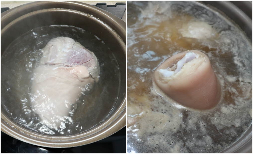 우선 쫄다리(쫄데기)를 끓는 물에 한번 데쳐줍니다. 오래 데치지 않아도 되죠. 약 2~5분정도만 끓는물에 넣고 끓여줍니다. 이 과정은 돼지고기에 있는 불순물을 제거해주는 과정이라고 생각하시면 됩니다.