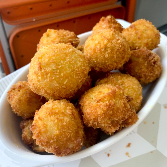 - 잘 섞인 내용물을 동그랗게 만들어 튀김가루, 계란물, 빵가루 순으로 묻혀주세요.